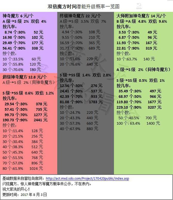 最后总结一下,不管双倍是哪种可能,按照镇楼图的概率洗是基本不会有错的因为在概率很低的情况下两种可能的潜能升级概率是非常近似的